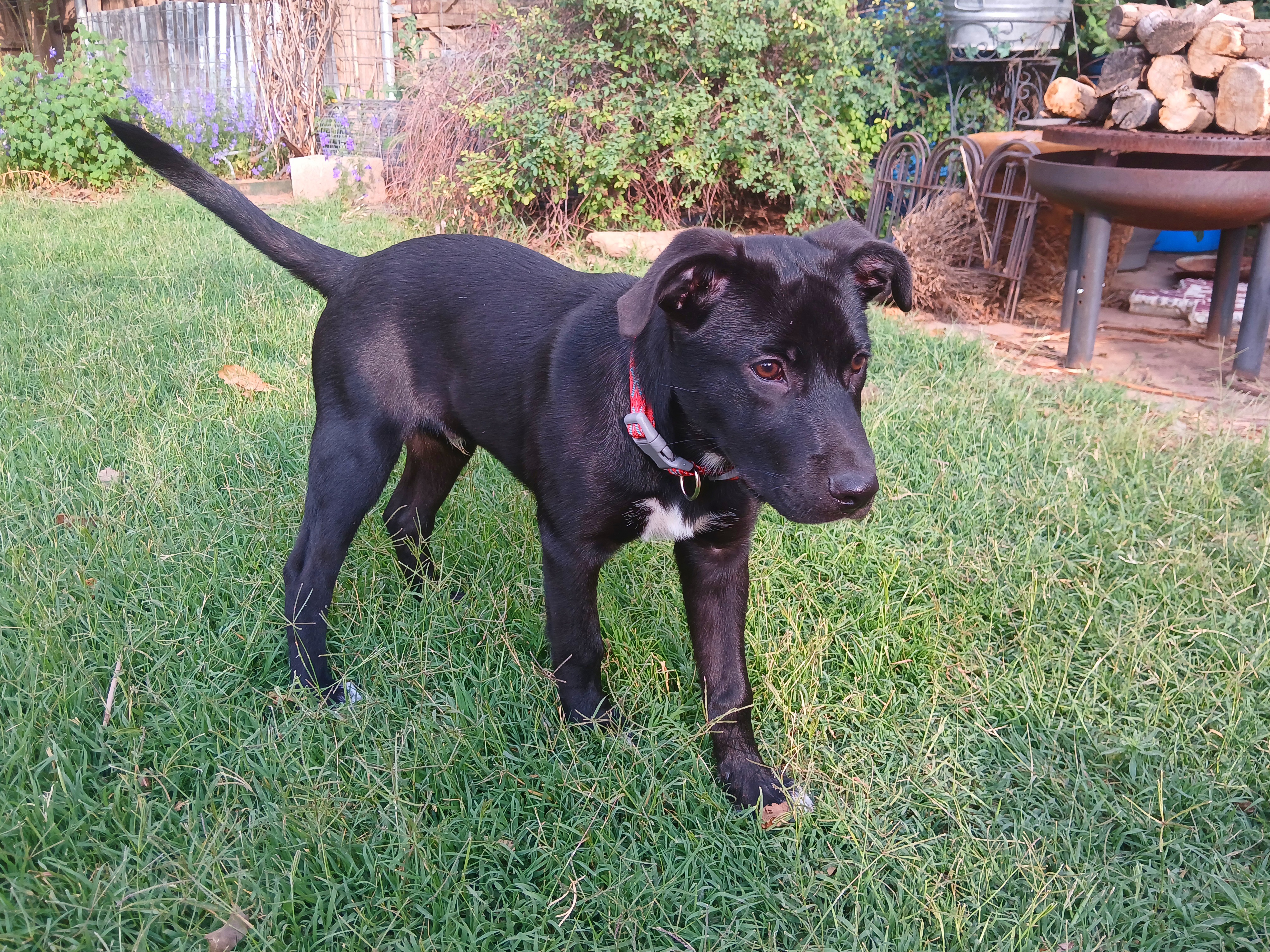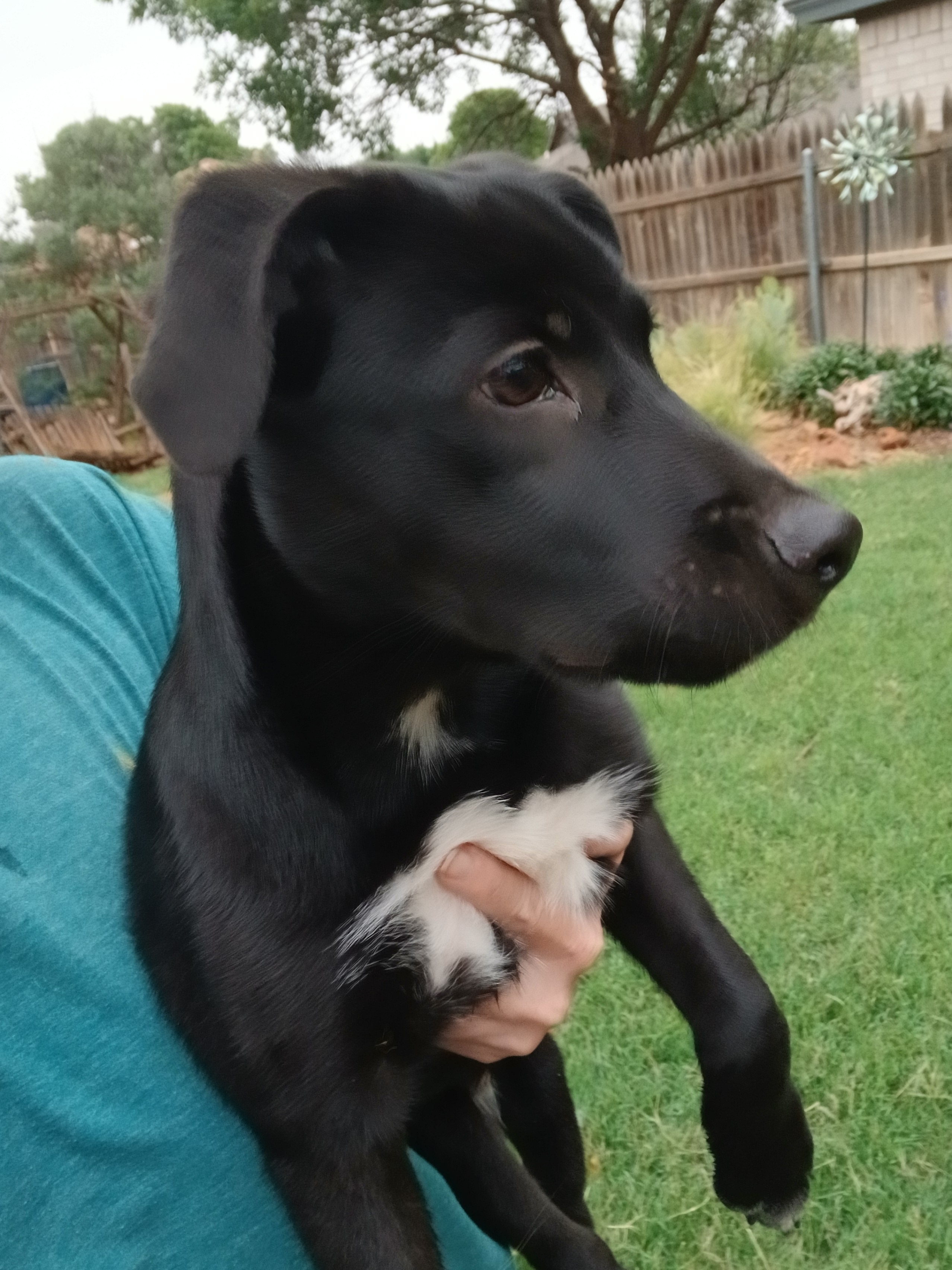 Meet Delta, an adorable black lab (?) pup who is looking for a new home! He is named for the white delta symbol on his chest.